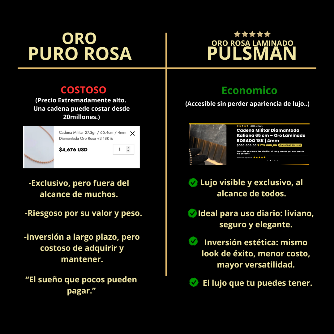 En Pulsman trabajamos con Oro Laminado de 18k, una aleación de alta calidad con un porcentaje real de oro de 18 quilates. Visualmente es indistinguible del oro macizo, pero con la ventaja de ser mucho más accesible 💎.