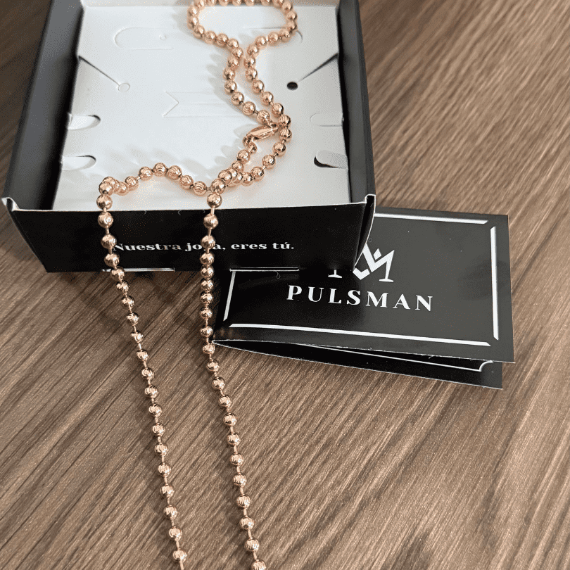 "La cadena laminada rosada llegó en perfectas condiciones. Tiene un brillo brutal y parece oro sólido, nadie nota la diferencia. Totalmente recomendado."